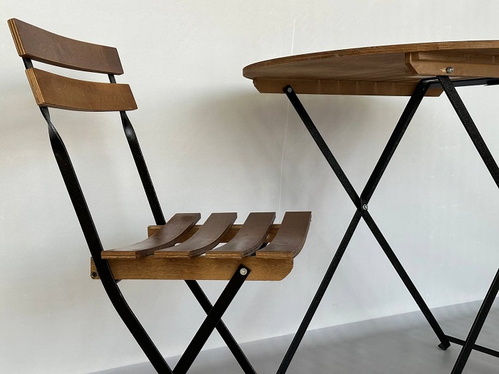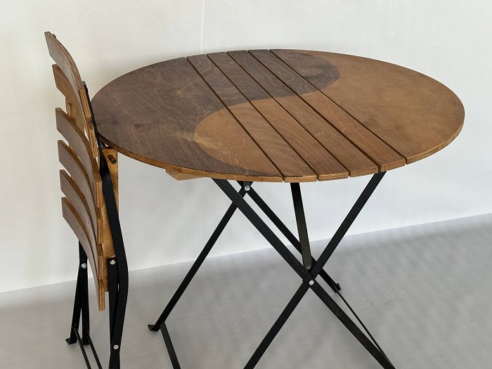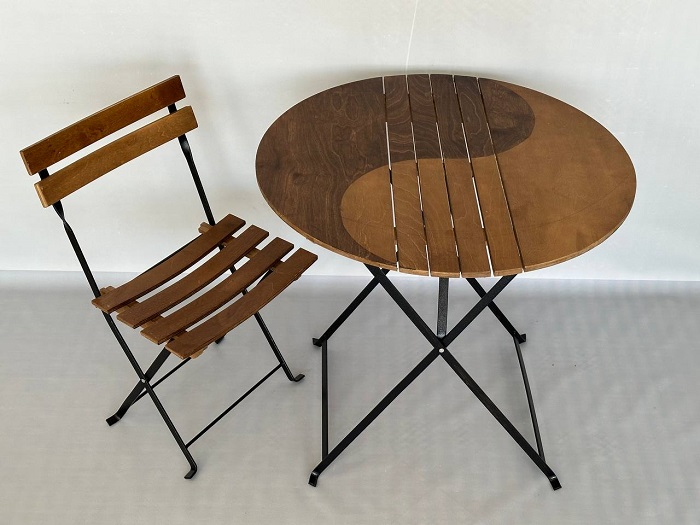 میز گرد دو نفره و صندلی قوس دار تاشو.